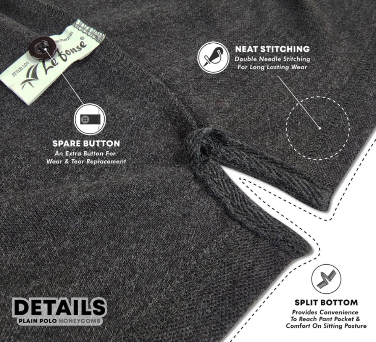 Kain Honeycomb lembut dan senang dijaga—tak mudah kedut, memastikan anda nampak kemas dan smart dalam setiap pemakaian.